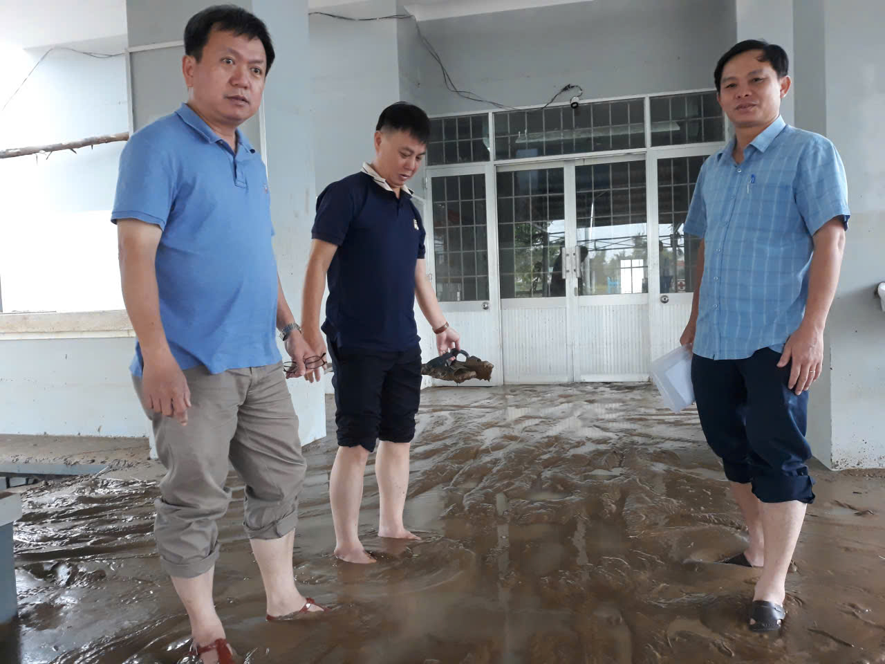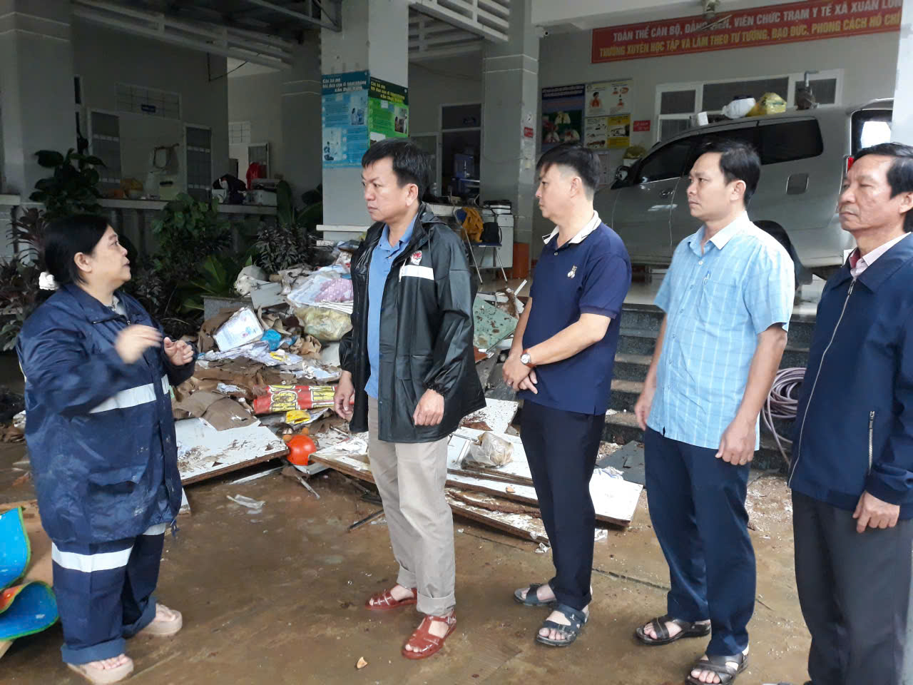 Bs.CKII Huỳnh Lê Xuân Bích, Phó Giám đốc Sở Y tế trao đổi với lãnh đạo Trạm Y tế Xuân Long về thiệt hại của Trạm sau lũ lụt.