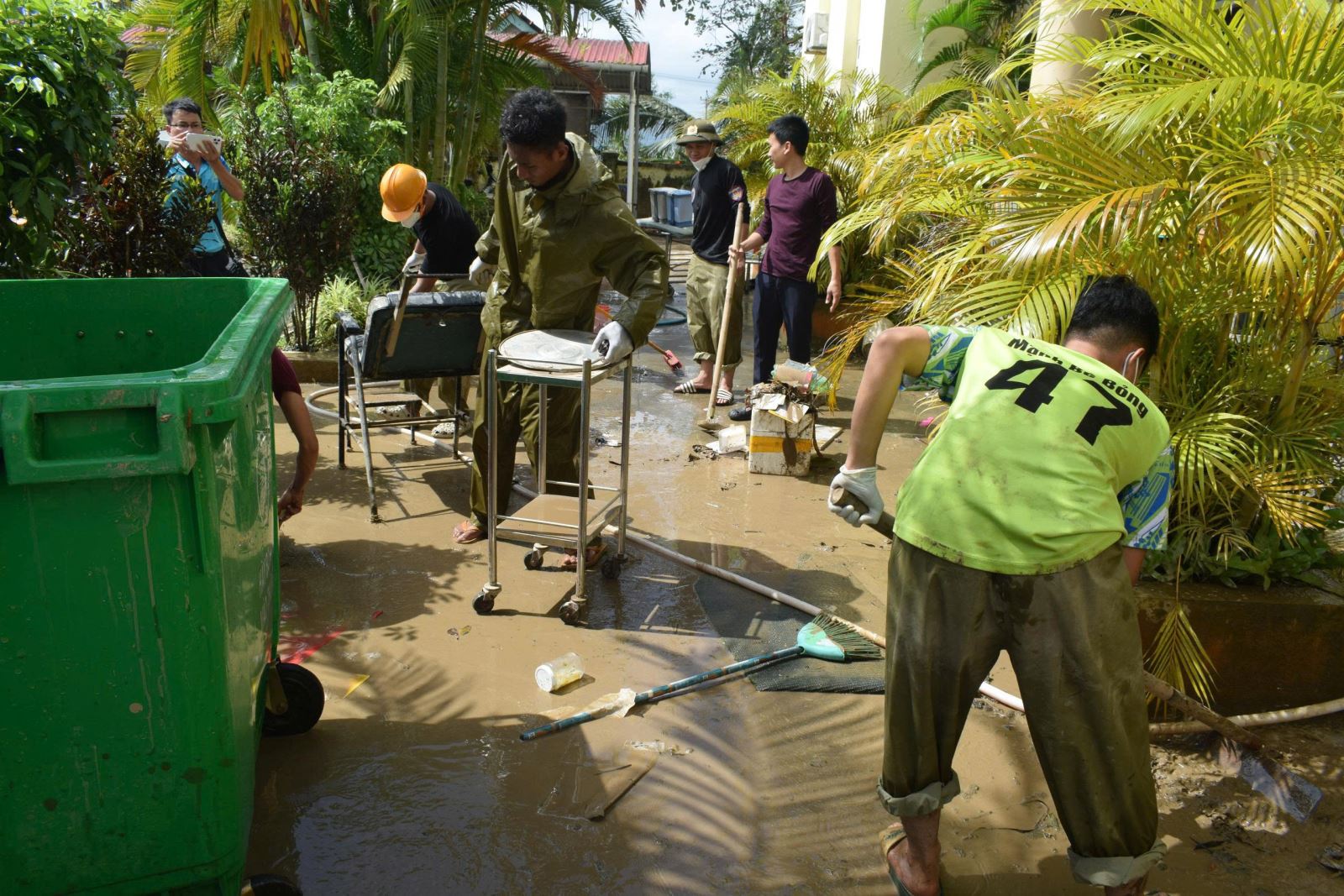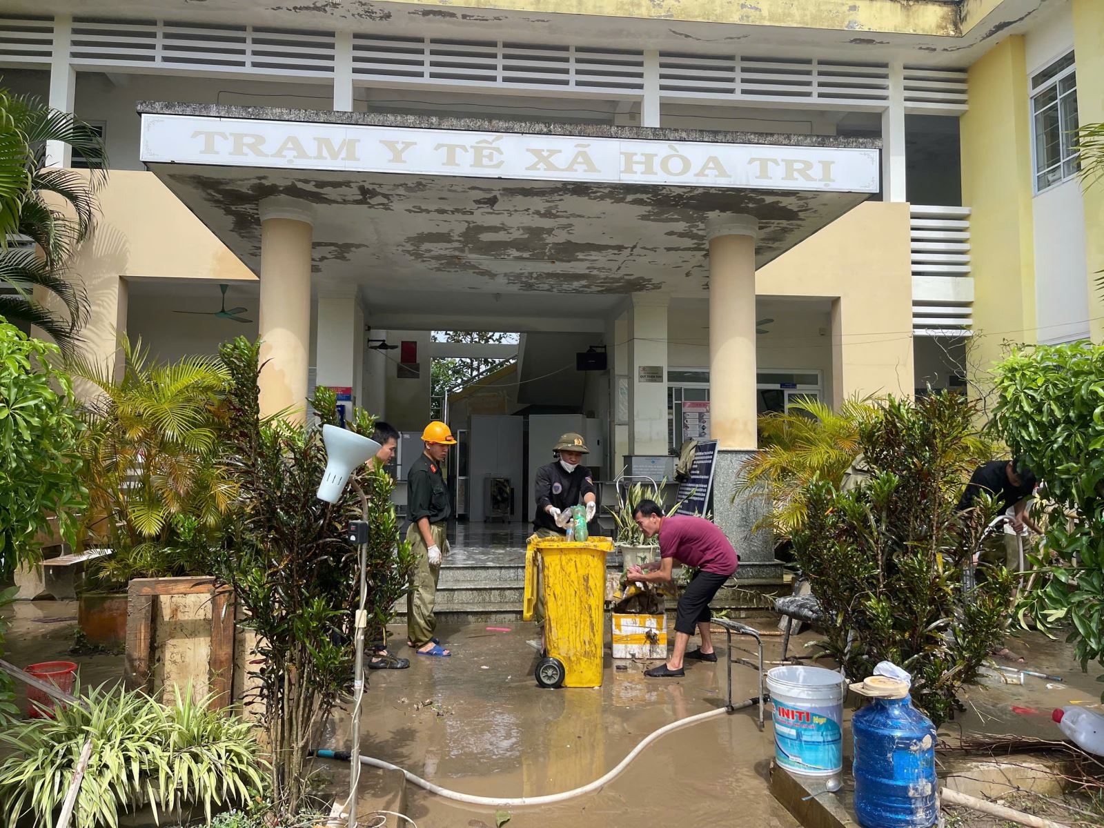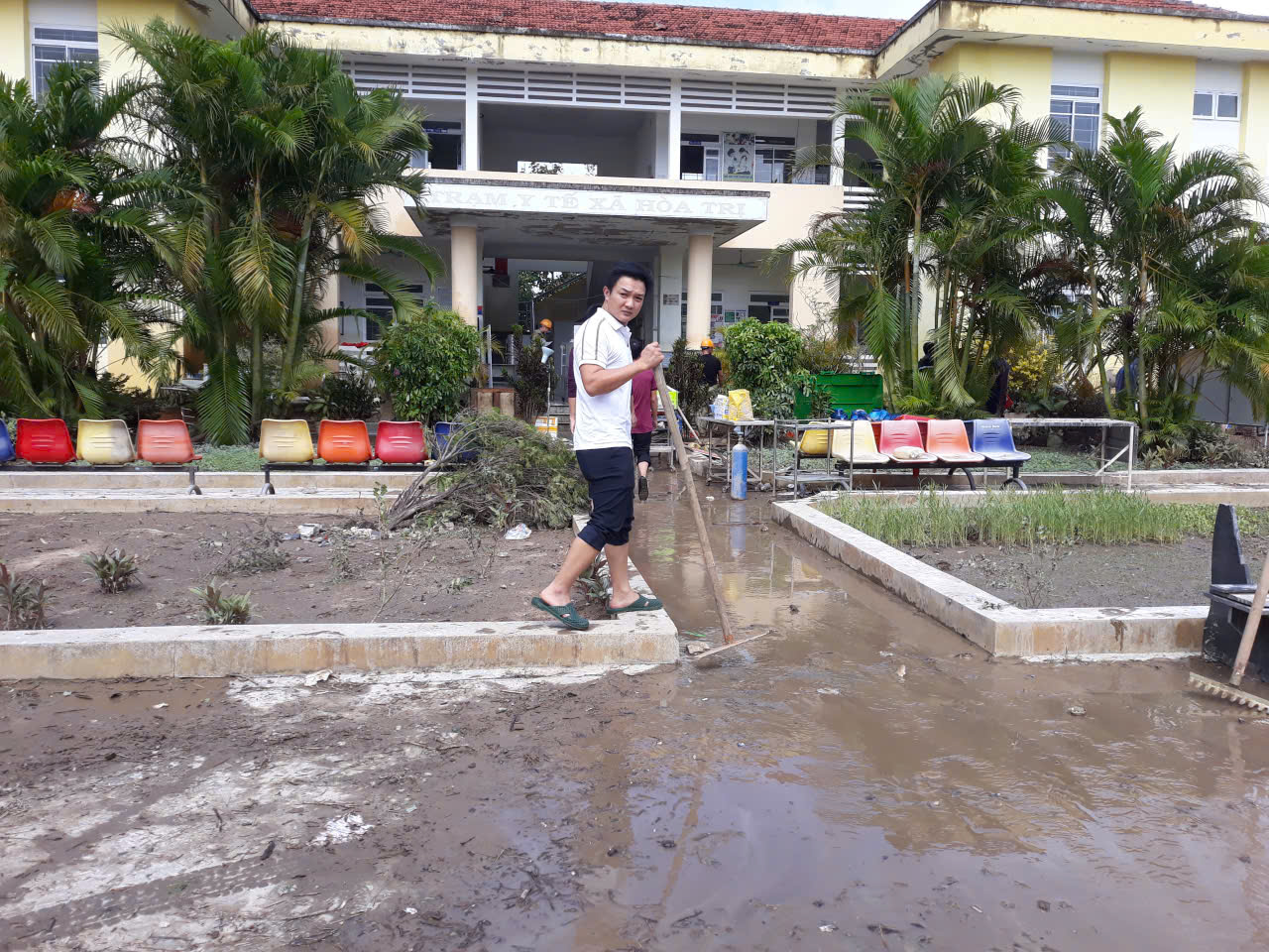 Cán bộ Trạm Y tế Hòa Trị nỗ lực dọn dẹp đơn vị sau lũ.