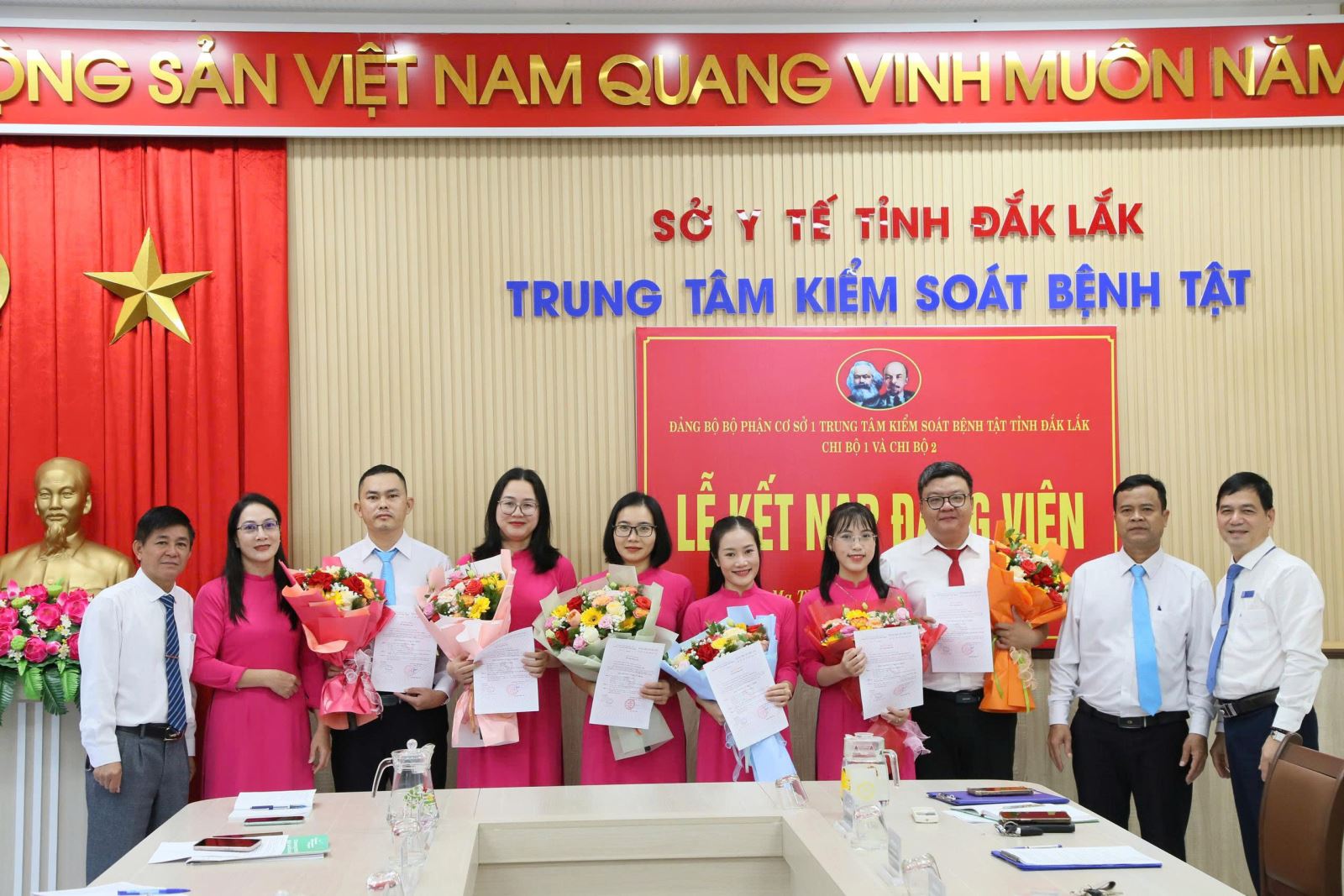 Thực hiện các Quyết định số 258//QĐ-ĐU ngày 11/11/2025 và quyết định số 266, 268, 270, 274/QĐ-ĐU ngày 18/11/2025, 335/QĐ-ĐU ngày 26/11/2025 của Đảng ủy UBND tỉnh Đắk Lắk về việc kết nạp đảng viên. Sáng 05/12/2025, được sự đồng ý của Đảng bộ bộ phận cơ sở 1 Trung tâm Kiểm soát bệnh tật (TTKSBT), Chi bộ 1 và Chi bộ 2 thuộc Đảng bộ bộ phận cơ sở 1 TTKSBT đã tổ chức Lễ kết nạp đảng viên cho 6 đồng chí gồm: Nguyễn Hữu Thiện, Đỗ Hữu Thành, Nguyễn Thị Mai Lê, Nguyễn Thị Thanh Nga, Bành Thị Mỹ Hoa, Võ Thị Quỳnh vào Đảng Cộng Sản Việt Nam. Các đồng chí đại diện Ban Chấp hành Đảng bộ bộ phận cơ sở 1 TTKSBT, cấp ủy và đảng viên các chi bộ 1, 2, 3, 4, 5 đã về tham dự.