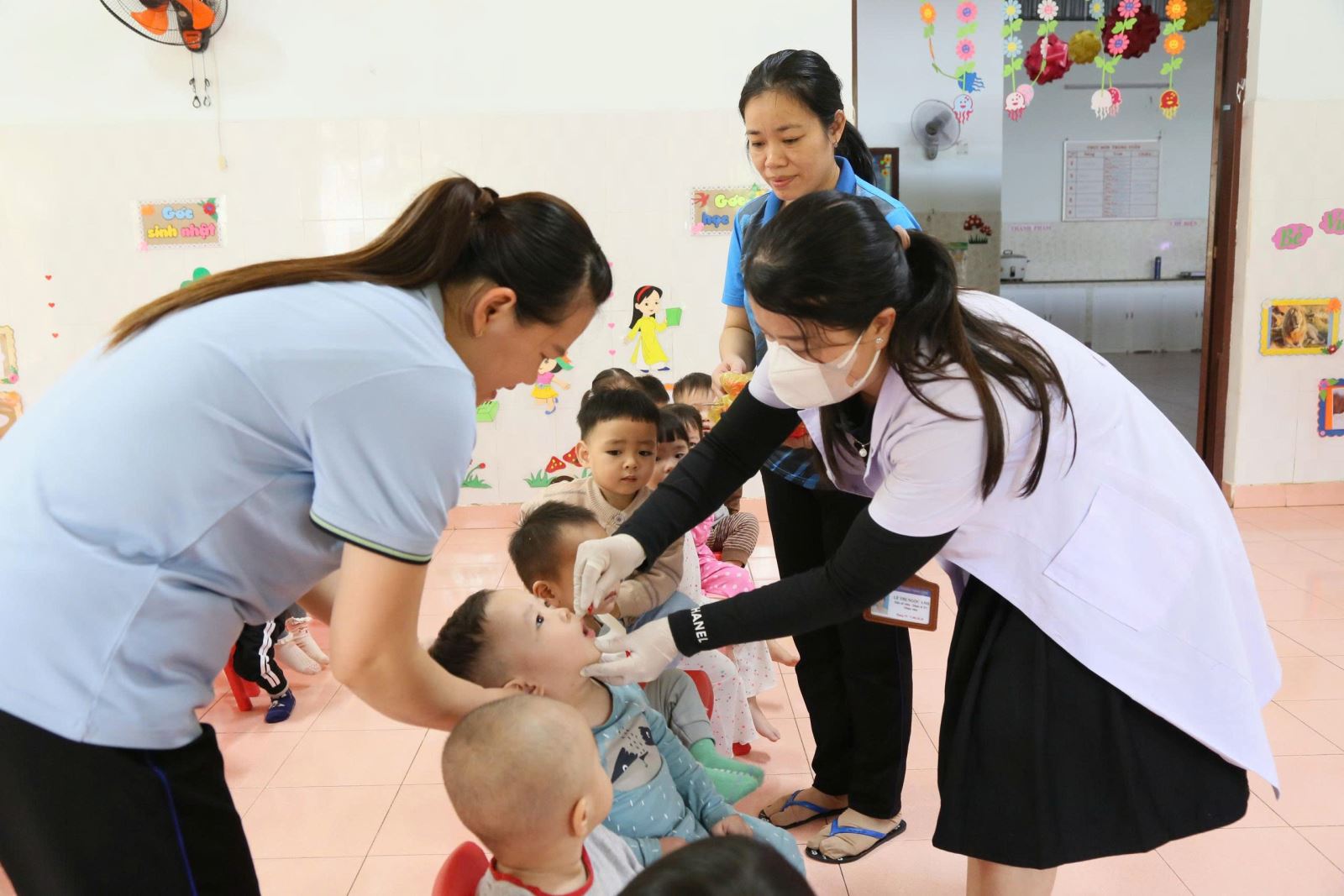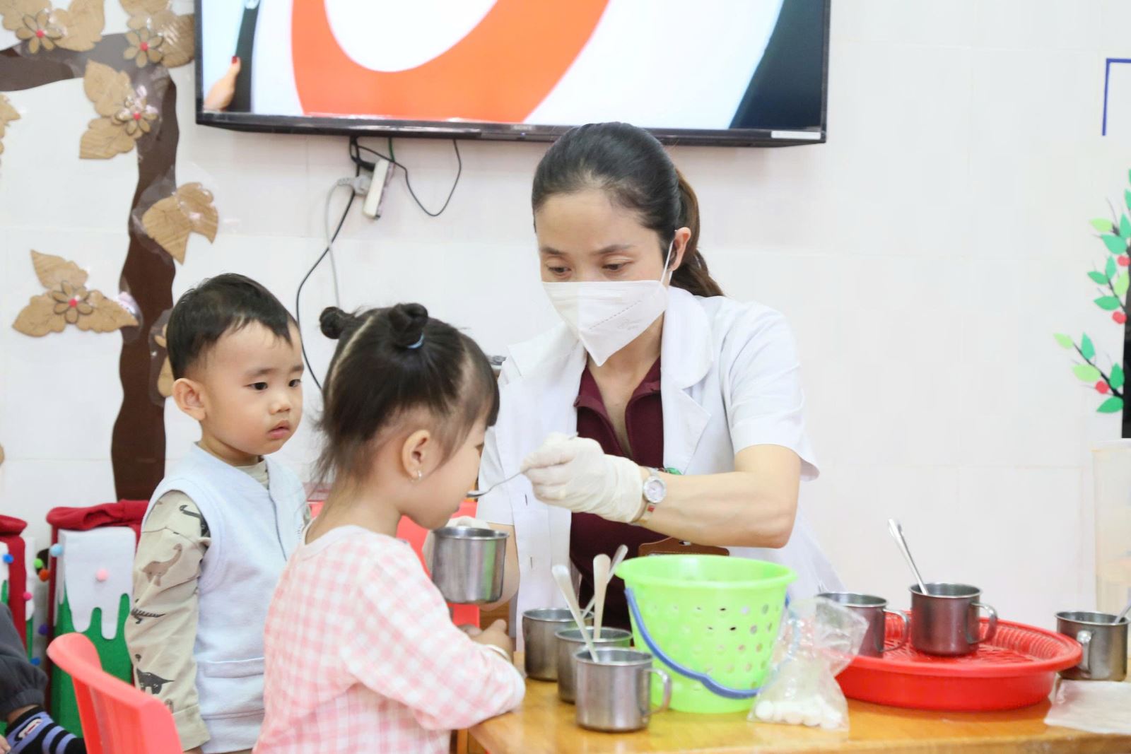 Cán bộ Trạm Y tế Thành Công phối hợp cùng giáo viên cho trẻ uống vitamin A tại trường học trên địa bàn