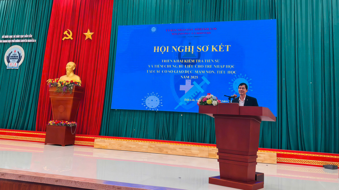 Sáng 30/12, tại Trường THPT Chuyên Nguyễn Du (phường Tân An, tỉnh Đắk Lắk), Sở Giáo dục và Đào tạo tỉnh phối hợp với Trung tâm Kiểm soát bệnh tật (CDC) đã tổ chức Hội nghị sơ kết triển khai kiểm tra tiền sử và tiêm chủng bù liều cho trẻ nhập học tại các trường mầm non, tiểu học phía Tây tỉnh Đắk Lắk. Tham dự hội nghị có Thạc sĩ, bác sĩ Hoàng Hải Phúc – Giám đốc Trung tâm Kiếm soát bệnh tật, bà Lê Thị Thảo – Trưởng phòng Giáo dục Phổ thông - Sở Giáo dục và Đào tạo cùng đại diện các phòng chuyên môn, đơn vị y tế và cơ sở giáo dục liên quan.