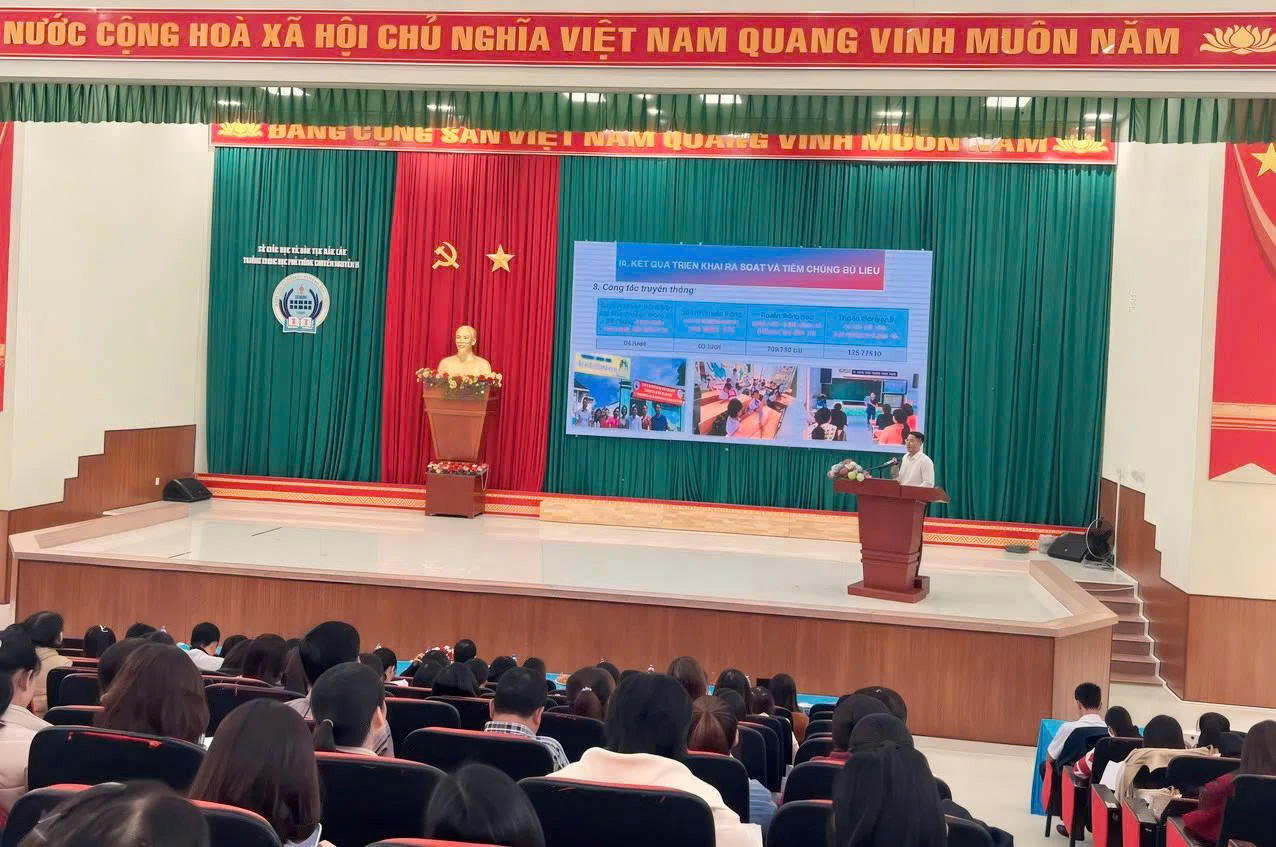Theo báo cáo tại hội nghị, trong năm học 2024–2025, khu vực phía Tây tỉnh Đắk Lắk có tổng cộng 762 trường mầm non và tiểu học. Nhằm triển khai hiệu quả chương trình tiêm chủng bù liều cho trẻ nhập học, từ tháng 4/2024, CDC tỉnh đã tổ chức các hội thảo phổ biến kế hoạch cho hai ngành Y tế và Giáo dục, đồng thời triển khai các lớp tập huấn TOT cấp tỉnh. Từ tháng 5 đến tháng 8/2024, ngành Y tế phối hợp với ngành Giáo dục tổ chức tập huấn cho cán bộ trạm y tế và các trường mầm non, tiểu học. Trong giai đoạn từ tháng 9 đến tháng 10/2024, ngành Giáo dục tiến hành thu thập hồ sơ, lập danh sách trẻ cần rà soát tiền sử tiêm chủng. Từ tháng 10 đến tháng 11/2024, ngành Y tế thực hiện rà soát tiền sử tiêm chủng và lập danh sách trẻ còn thiếu mũi, cần tiêm bù liều. Hoạt động tiêm chủng bù liều được triển khai từ tháng 10/2024 đến tháng 5/2025. Kết quả cho thấy, 100% (762/762) trường mầm non và tiểu học trên địa bàn đã thực hiện rà soát tiền sử tiêm chủng cho trẻ, với tổng số 110.050 trẻ mầm non và 44.002 trẻ tiểu học được kiểm tra, đạt tỷ lệ 100%. Qua rà soát, tỷ lệ trẻ thiếu mũi tiêm cần được tiêm bổ sung tại các cơ sở giáo dục mầm non là 32,4% và tại các cơ sở giáo dục tiểu học là 35,7%. Để đảm bảo trẻ được tiêm chủng đầy đủ theo quy định, CDC tỉnh đã tổ chức tiêm bù các loại vắc xin như Viêm não Nhật Bản, Sởi, Sởi – Rubella và Bại liệt.