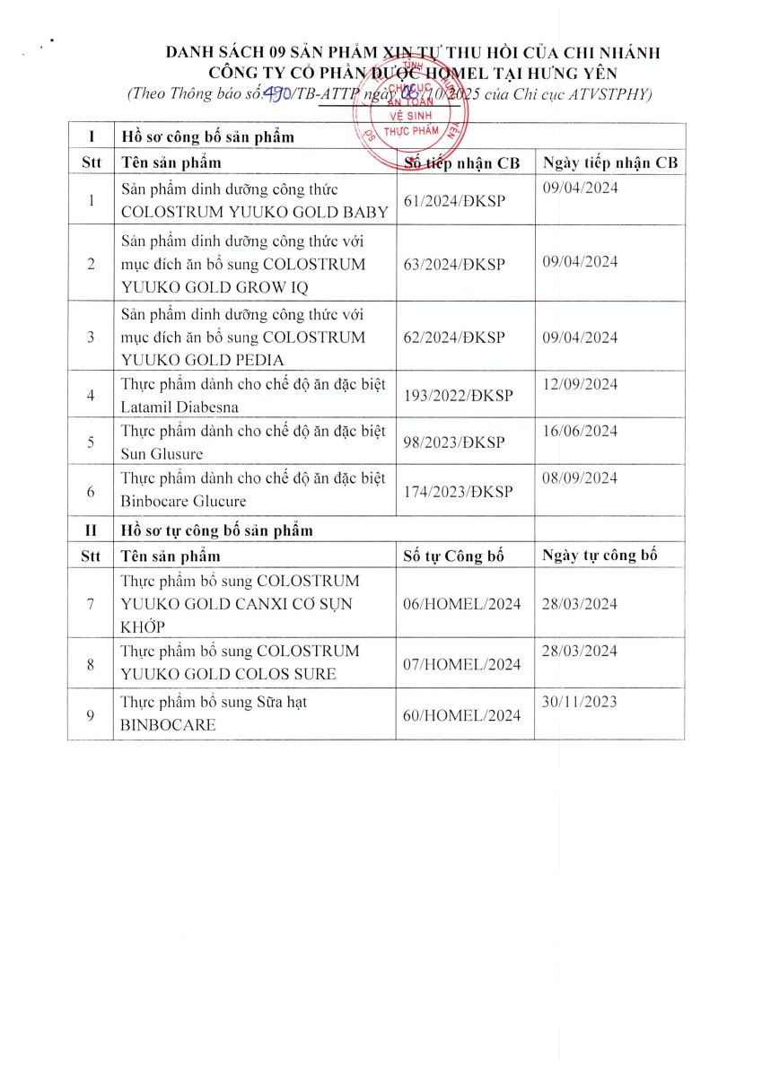 Kể từ ngày 29/9/2025, 09 sản phẩm của Chi nhánh Công ty Cổ phần Dược Homel tại Hưng Yên (địa chỉ: số 75 đường Nhân Dục, phường Phố Hiến, tỉnh Hưng Yên) không được phép lưu thông trên thị trường (danh sách sản phẩm kèm theo tại công văn).