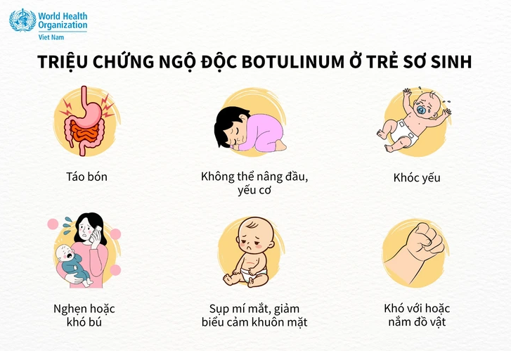 - Triệu chứng ngộ độc thường gặp ở trẻ(theo cảnh báo của WHO): Nghẹn hoặc khó bú; táo bón; bú kém hoặc lực bú yếu; sụp mí mắt, giảm biểu cảm khuôn mặt; khóc yếu; không thể nâng đầu, cơ yếu hoặc mềm nhũn (đặc biệt là nửa người trên và tay, chân); khó với hoặc cầm nắm đồ vật.