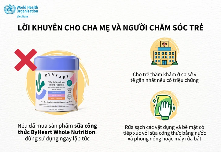 WHO khuyến cáo cha mẹ và người chăm sóc trẻ nếu đã mua sản phẩm, dừng sử dụng ngay lập tức. Đồng thời lưu ý và đưa trẻ tới cơ sở y tế gần nhất nếu trẻ có triệu chứng ngộ độc. Rửa sạch các vật dụng và bề mặt có tiếp xúc với sữa công thức./.