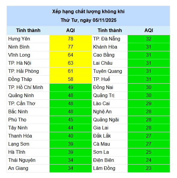 Xếp hạng chất lượng không khí ngày 05/11/2025