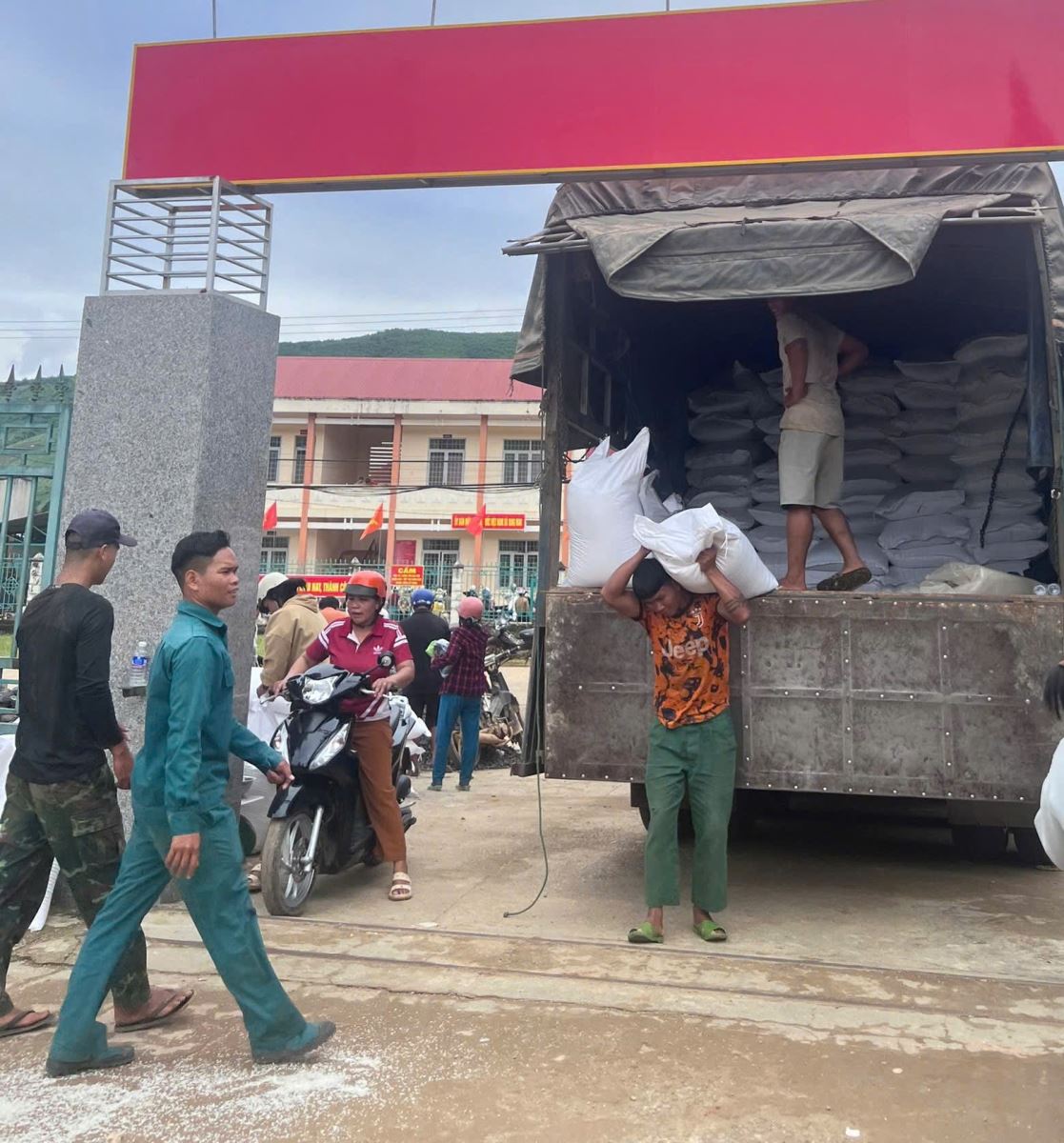Lực lượng hỗ trợ đang khẩn trương vận chuyển gạo cứu trợ từ xe tải