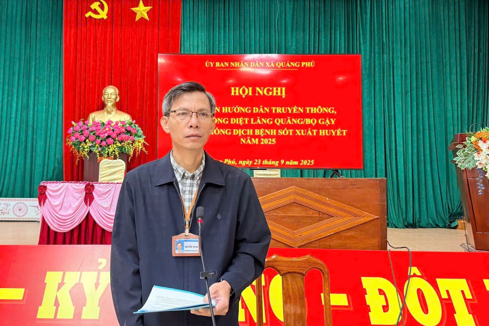 Ông Nguyễn Tự Do, Phó Chủ tịch UBND xã Quảng Phú phát biểu tại Hội nghị tập huấn với mong muốn mỗi học viên sẽ tiếp thu kiến thức cơ bản về phòng chống sốt xuất huyết để tập trung tuyên truyền, vận động người dân chung tay thực hiện.