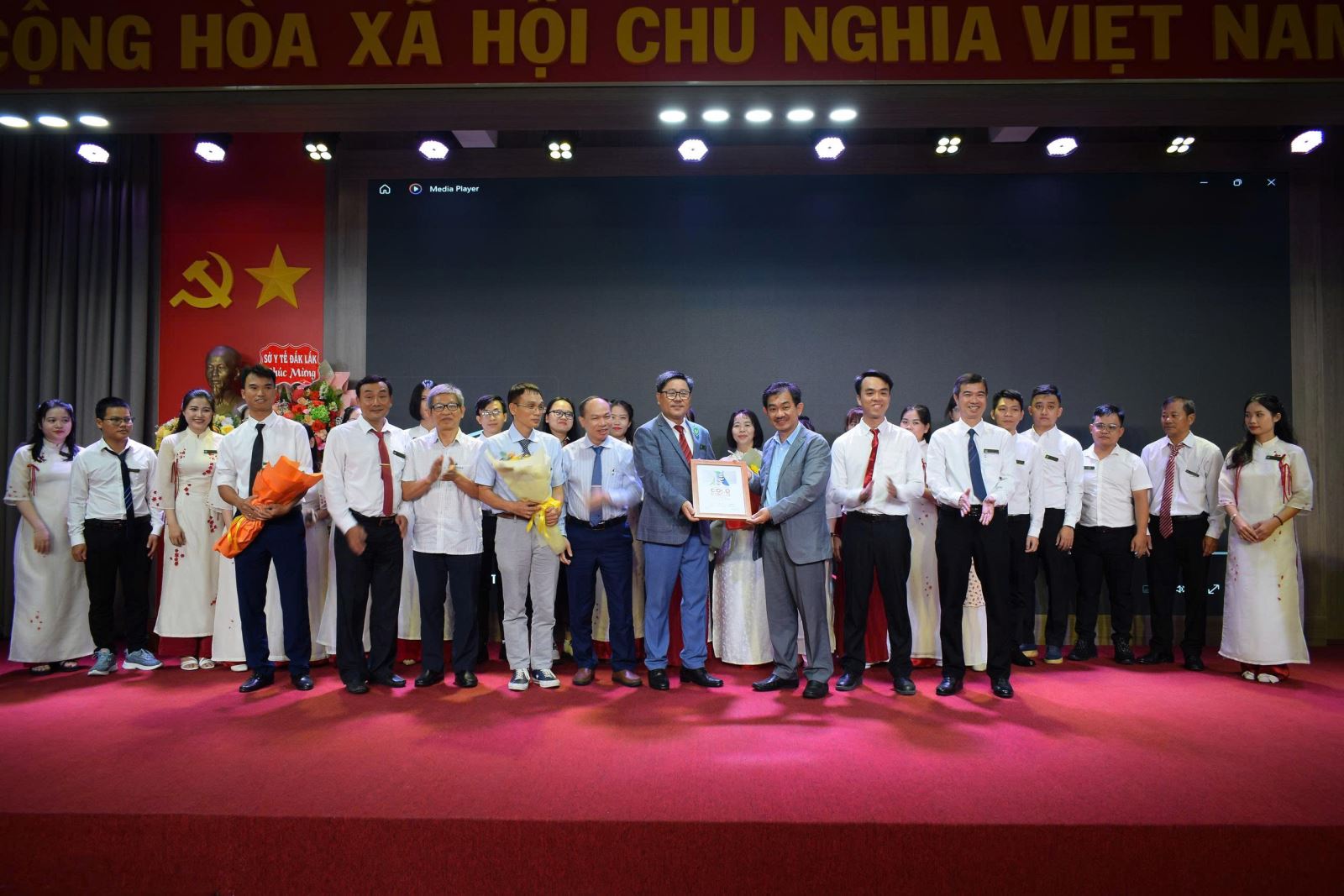 Bs.CKII Phạm Minh Hữu, Phó Giám đốc Sở Y tế và Bs.CKII Trần Anh Dũng, Giám đốc Bệnh viện Đa khoa Phú Yên tặng hoa và lưu niệm cho Bệnh viện Nhân dân 115 Thành phố Hồ Chí Minh đã có những đóng góp cho sự phát triển của lĩnh vực đột quỵ tại Bệnh viện Đa khoa Phú Yên.