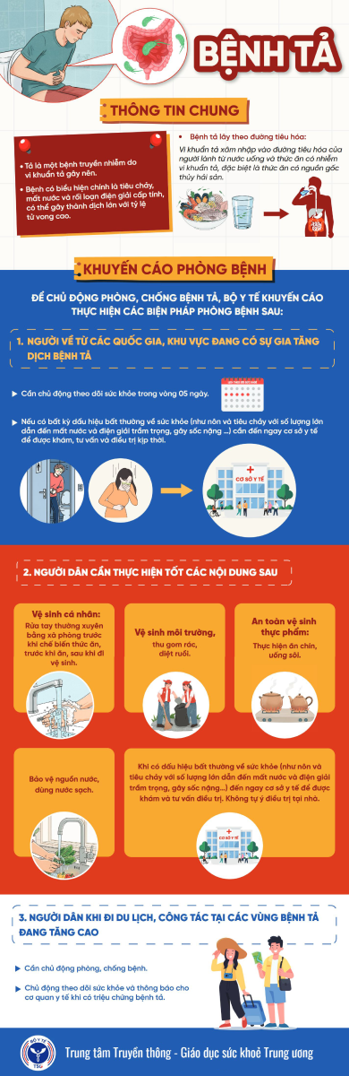 - Đẩy mạnh công tác truyền thông, giáo dục sức khỏe trên các phương tiện thông tin đại chúng. Nội dung truyền thông cần tập trung vào đặc điểm bệnh tả, triệu chứng điển hình, đường lây truyền và các biện pháp phòng chống để người dân chủ động thực hiện các biện pháp phòng chống và kịp thời đến cơ sở y tế để được khám, tư vấn và điều trị đúng hướng dẫn.