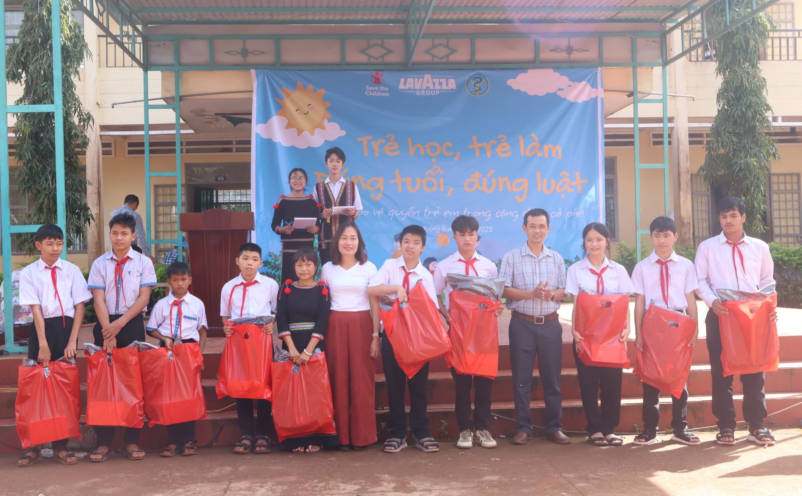 Bên cạnh đó, học sinh được gặp gỡ, trực tiếp giao lưu với đại diện của Tổ chức Save the Children để chia sẻ về những khó khăn trong cuộc sống, vấn đề bỏ học, lao động sớm của trẻ em. Cũng trong dịp này, tổ chức Save the Children đã trao 10 phần quà cho 10 học sinh có hoàn cảnh đặc biệt khó khăn cùng nhiều phần quà khích lệ tinh thần học tập.