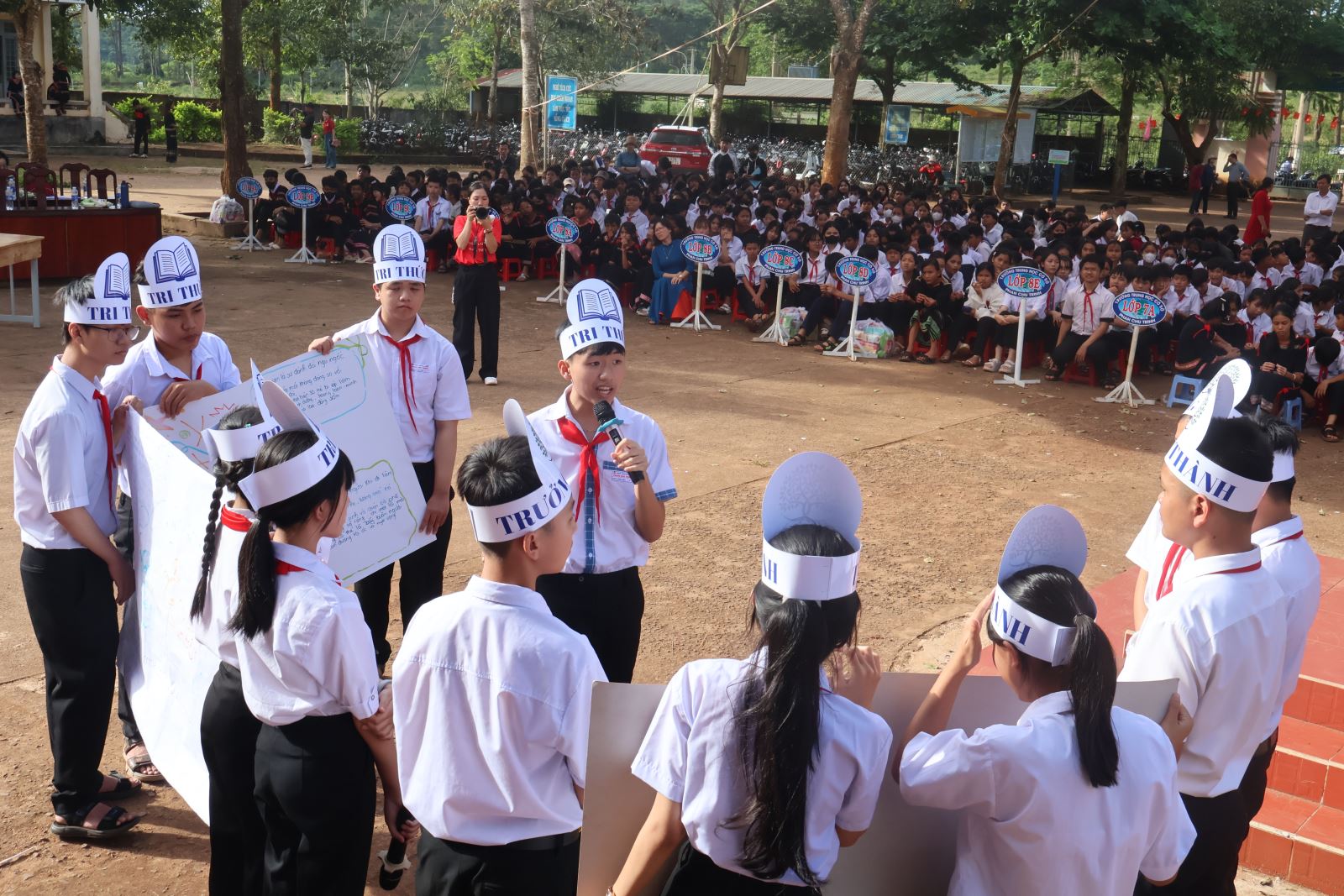 Buổi truyên thông diễn ra trong không khí sôi nổi với nhiều hoạt động thiết thực và bổ ích như: nhảy đồng diễn, tốp ca, hài kịch phản ánh thực trạng đáng lo ngại – trẻ em bỏ học sớm để lao động. Tại đây, học sinh được chia nhóm tham gia trò chơi kết hợp hoàn thành chủ đề, thông điệp như: “Đến trường hôm nay, tươi sáng ngày mai”; “Lao động sớm, đánh mất ước mơ trẻ”…; bàn luận việc Trẻ em nên đi làm thêm để kiếm tiền phụ giúp bố mẹ hay Trẻ em không nên đi làm.