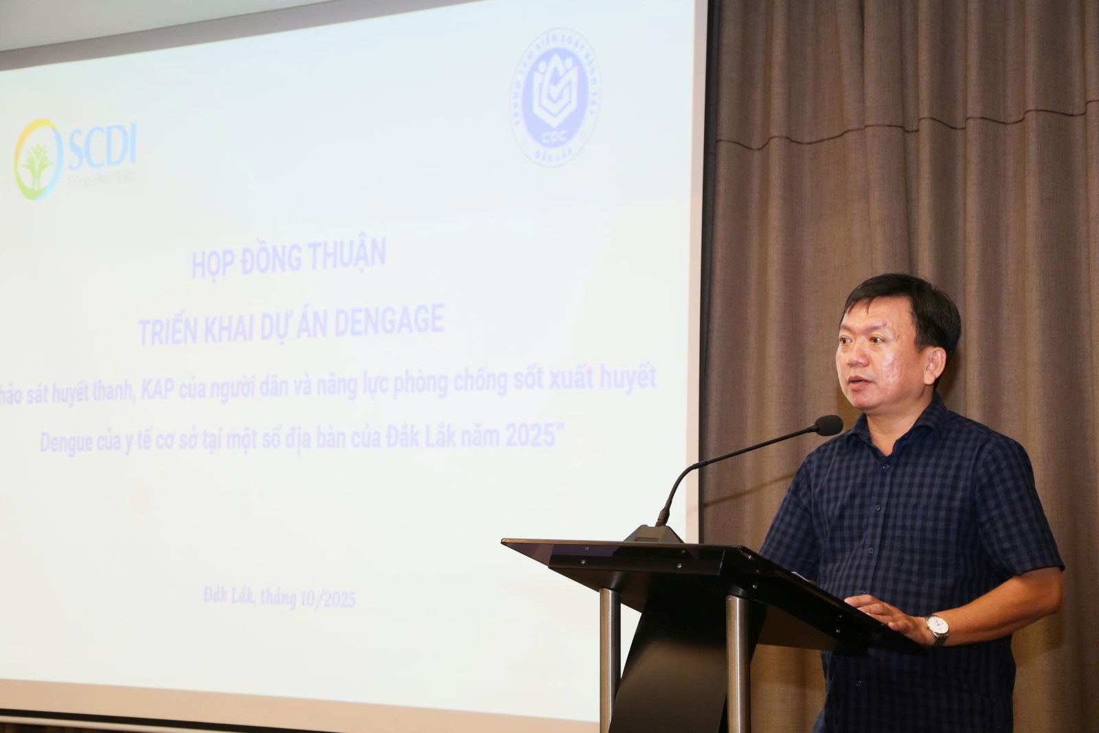 Sáng 31/10/2025, Trung tâm Kiểm soát bệnh tật tỉnh Đắk Lắk (CDC Đắk Lắk) phối hợp với Trung tâm Hỗ trợ Sáng kiến Phát triển Cộng đồng (SCDI) và Trường Đại học Y Dược Hải Phòng tổ chức Chương trình họp đồng thuận triển khai Dự án DENGAGE với chủ đề: “Khảo sát huyết thanh, KAP của người dân và năng lực phòng chống sốt xuất huyết Dengue của y tế cơ sở tại một số địa bàn của tỉnh Đắk Lắk năm 2025”.  Tham dự chương trình có ThS.BSCKII Huỳnh Lê Xuân Bích – Phó Giám đốc Sở Y tế; ThS.BSCKII Lê Phúc – Phó Giám đốc CDC Đắk Lắk; ThS. Nhâm Thị Tuyết Thanh – Phó Giám đốc SCDI; PGS.TS. Vũ Hải Vinh – Trưởng khoa Bệnh Nhiệt đới, Bệnh viện Việt Tiệp Hải Phòng, cùng đại diện các Trung tâm Y tế, UBND xã, phường và Trạm Y tế trên địa bàn tỉnh.