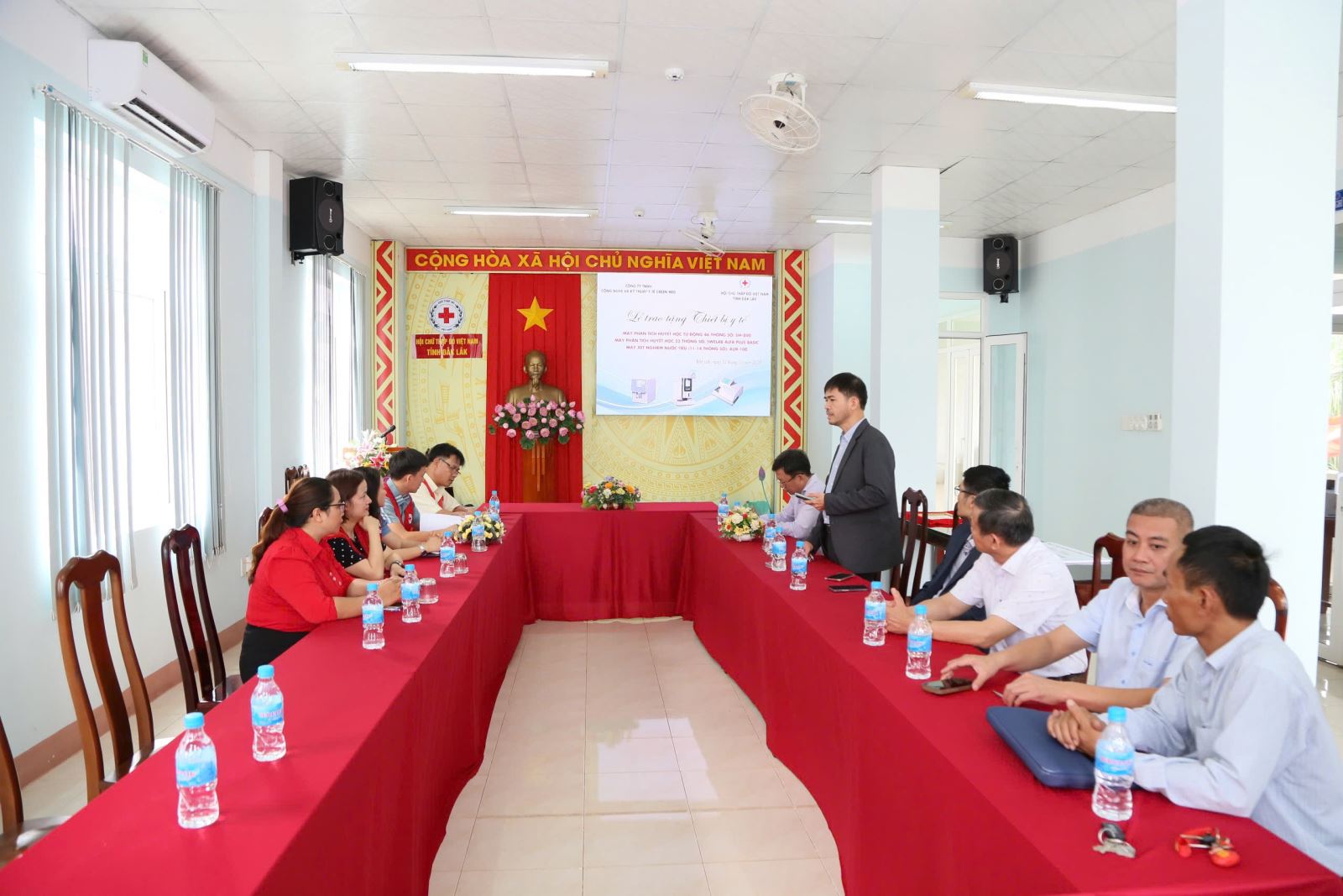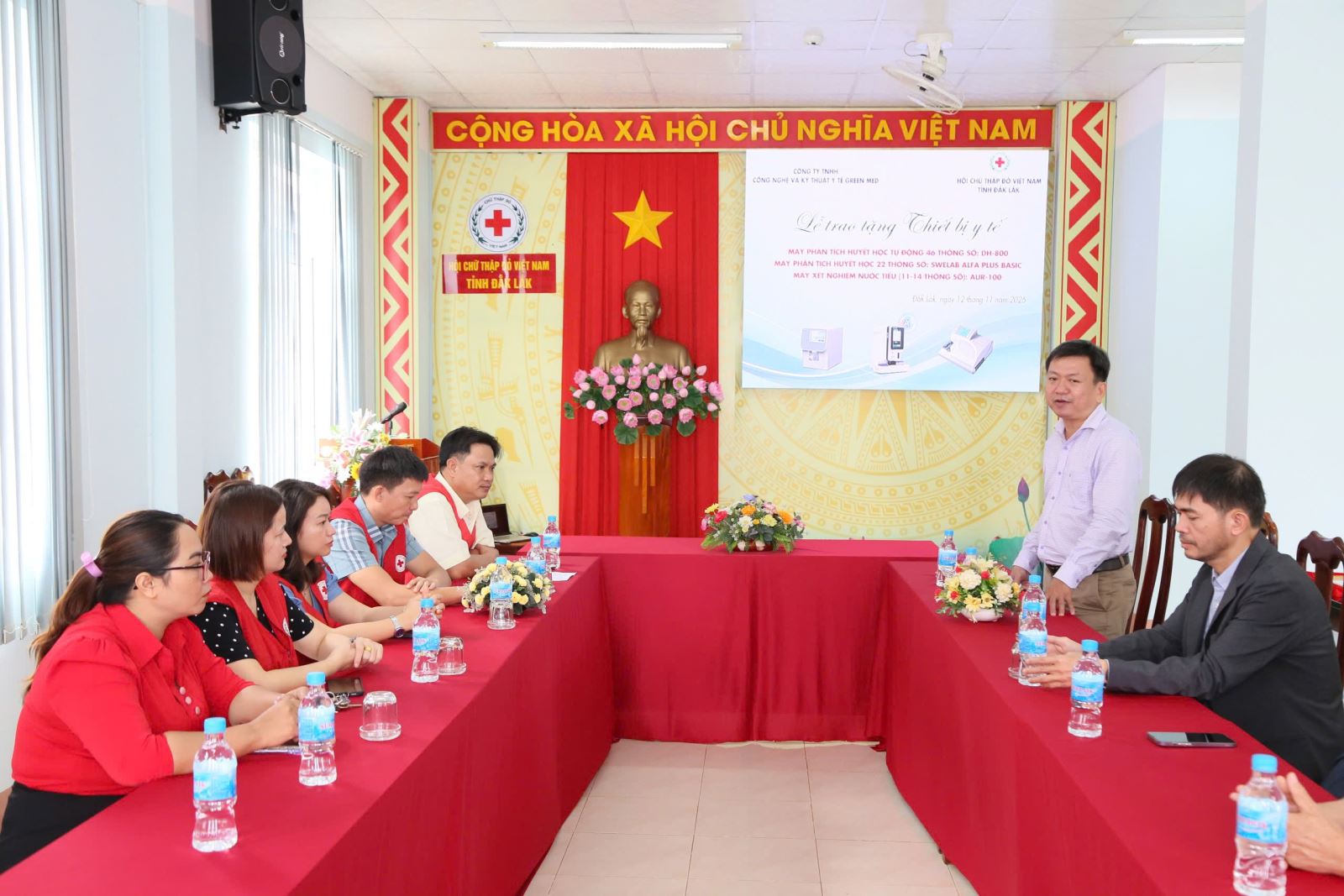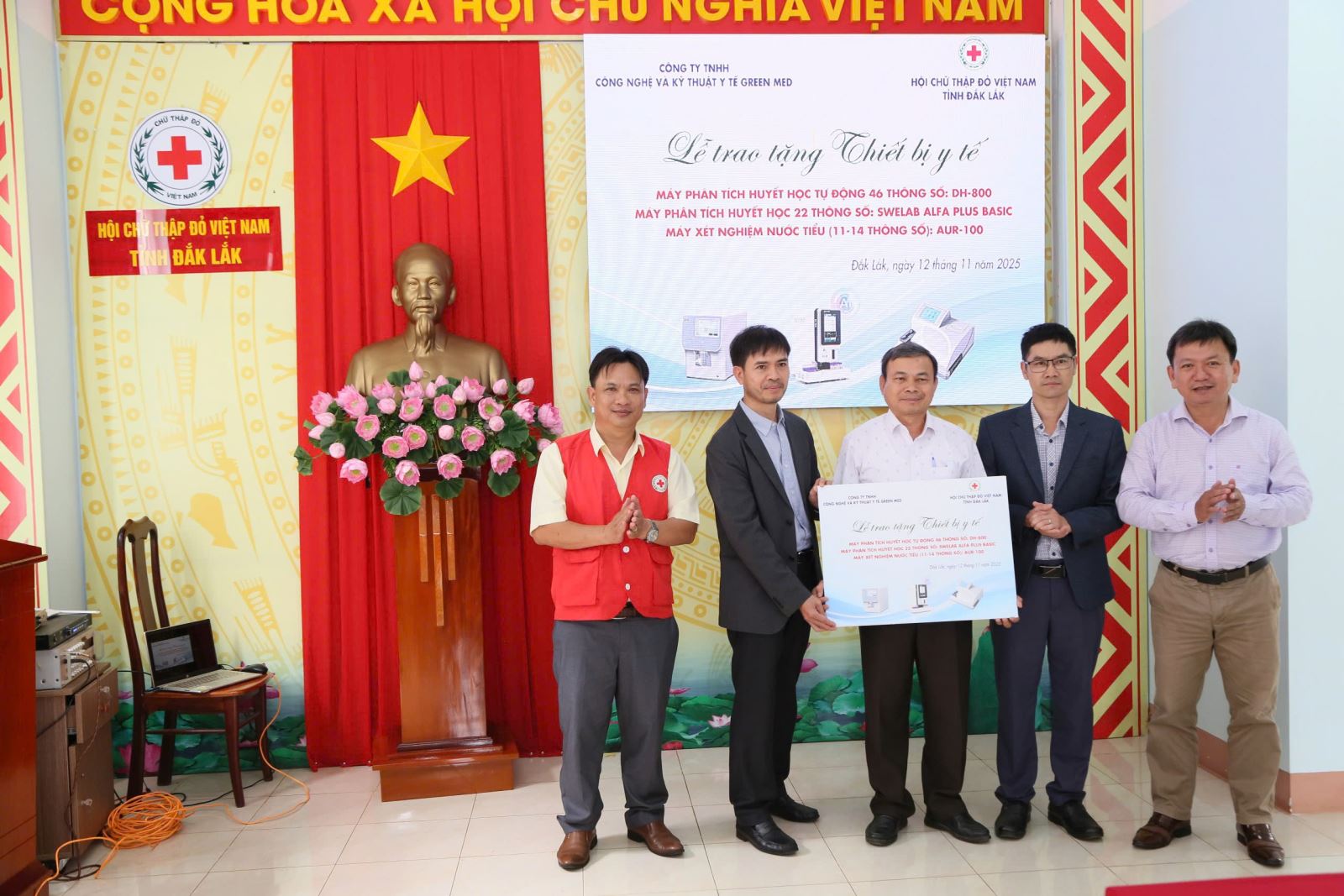 Sáng 12/11, Công ty TNHH Công nghệ và Kỹ thuật Y tế Green Med phối hợp với Hội Chữ thập đỏ tỉnh Đắk Lắk đã tổ chức Lễ trao tặng thiết bị y tế cho các đơn vị y tế trên địa bản tỉnh Đắk Lắk. Ông Huỳnh Lê Xuân Bích, Phó Giám đốc Sở Y tế tham dự buổi lễ.