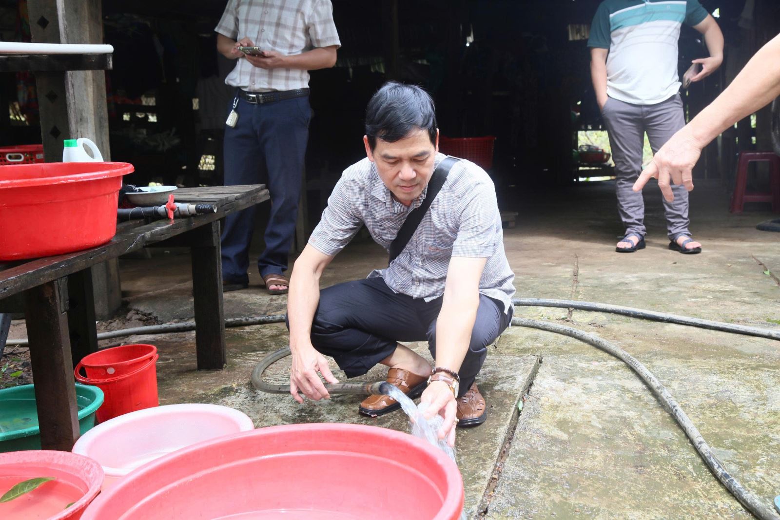 Đoàn công tác lấy mẫu nước tại giếng khoan của hộ gia đình bị ngập lụt do bão.