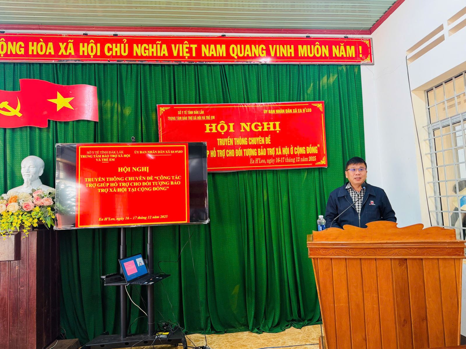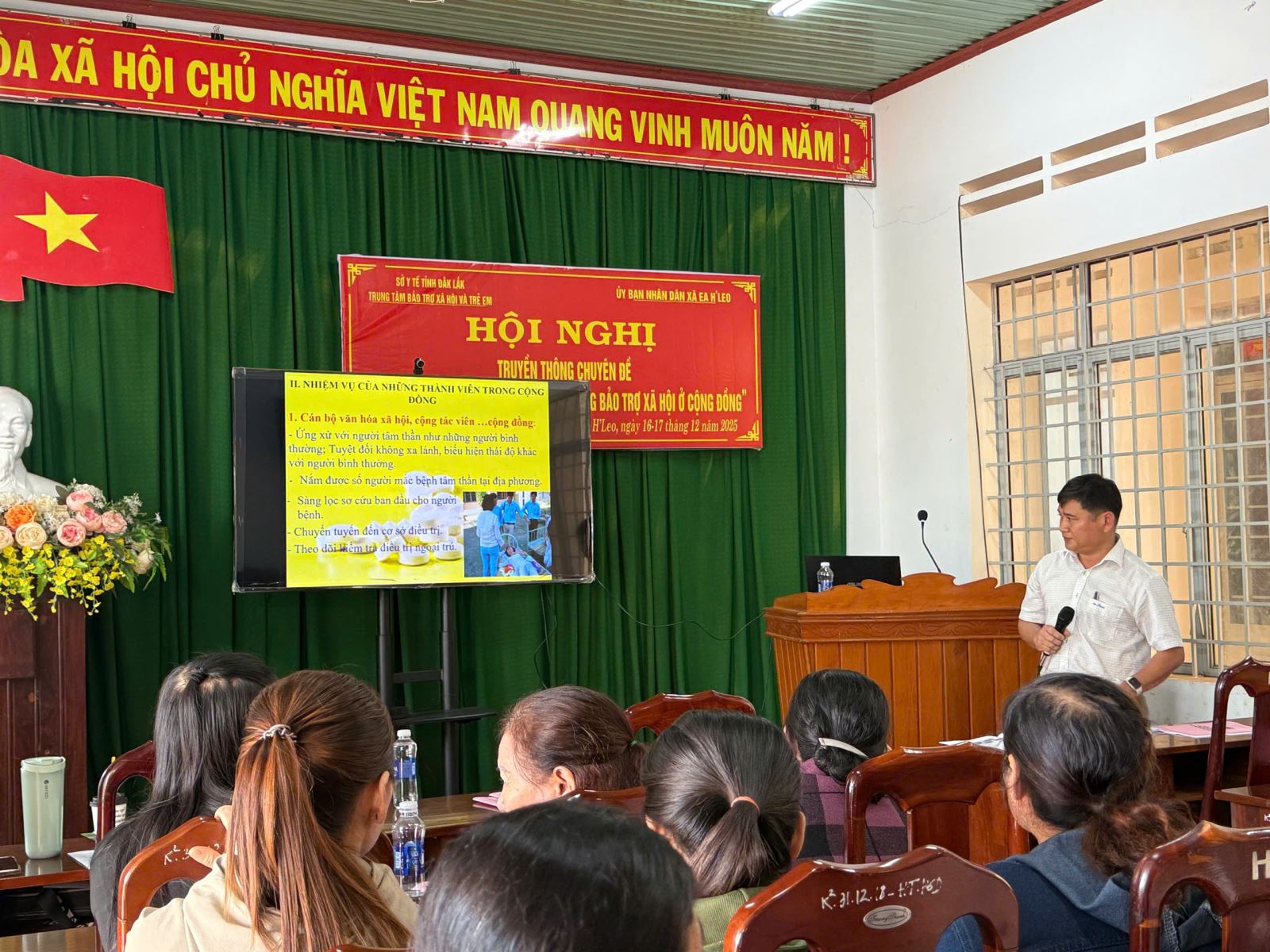 Ngày 16-17/12/2025, Trung tâm Bảo trợ xã hội và Trẻ em tỉnh đã phối hợp với Ủy ban nhân dân xã Ea H’Leo tổ chức Hội nghị truyền thông chuyên đề “Công tác trợ giúp cho đối tượng bảo trợ xã hội ở cộng đồng”. Đây là lớp tập huấn thứ ba trong năm 2025 dành cho đội ngũ cộng tác viên công tác xã hội cộng đồng, nằm trong chương trình nâng cao nghiệp vụ công tác xã hội do Trung tâm Bảo trợ xã hội và Trẻ em tỉnh triển khai. Đại diện Lãnh đạo Trung tâm Bảo trợ xã hội và Trẻ em tỉnh; đại diện các phòng, ban liên quan của xã Ea H’Leo; cán bộ văn hóa – xã hội; cộng tác viên công tác xã hội ở thôn, buôn và đại diện gia đình các đối tượng bảo trợ xã hội trên địa bàn đã tham dự.