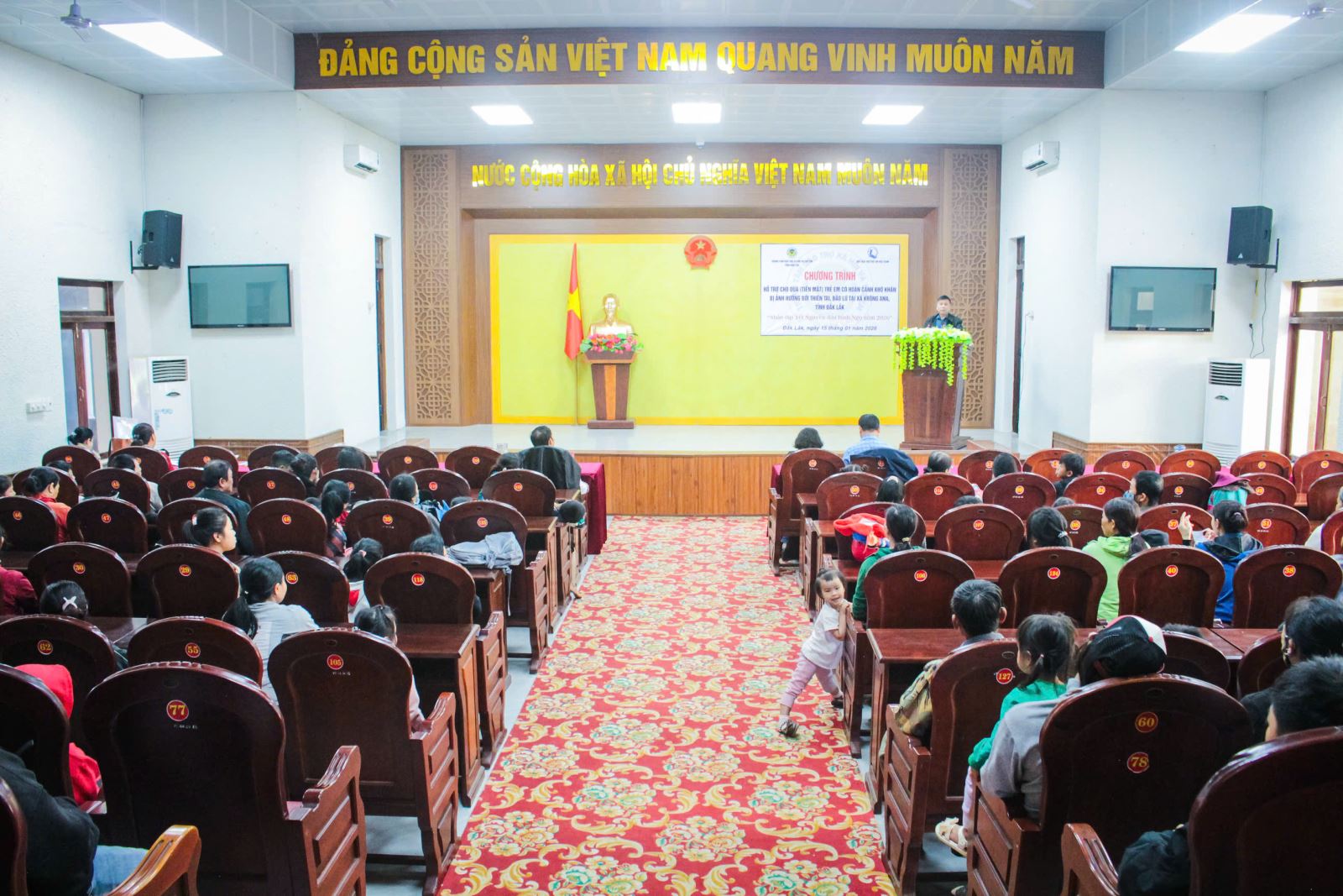 Trung tâm Bảo trợ xã hội và trẻ em và chính quyền địa phương xã Krông Ana trao hỗ trợ cho trẻ em.