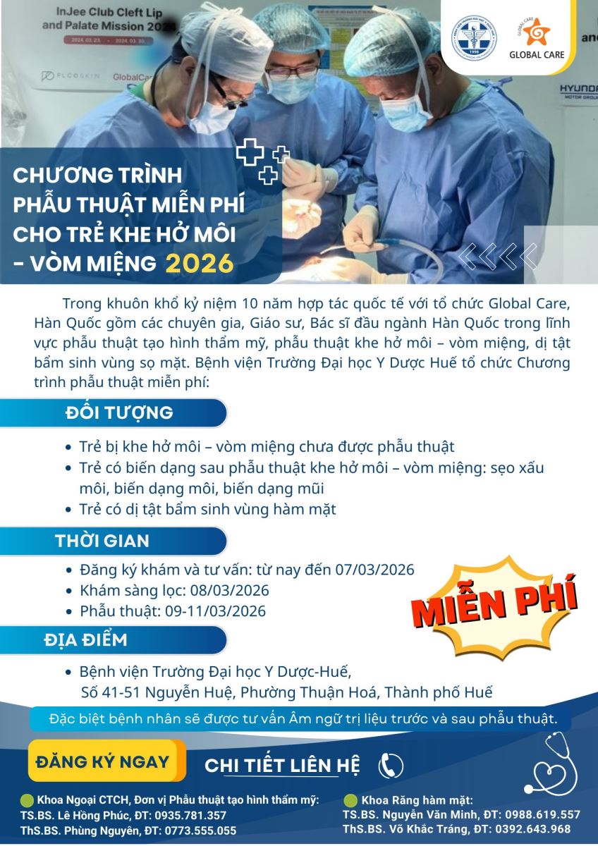 Nhằm giúp người dân có hoàn cảnh khó khăn được tiếp cận dịch vụ khám, điều trị và cải thiện chất lượng cuộc sống, đặc biệt là trẻ em và người dân ở khu vực miền núi, vùng sâu, vùng xa, trong thời gian tới, Bệnh viện Trường Đại học Y – Dược Huế phối hợp với Tổ chức Global Care (Hàn Quốc), cùng sự tham gia của nhiều chuyên gia đa ngành, giàu kinh nghiệm sẽ triển khai Chương trình phẫu thuật nhân đạo năm 2026 dành cho các bệnh nhân có nhu cầu khám và điều trị các dị tật bẩm sinh.