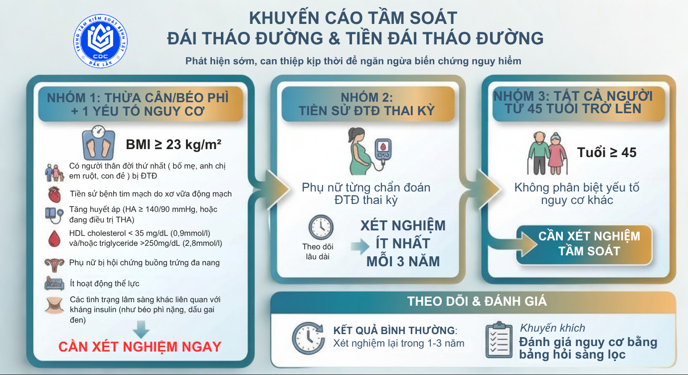 Theo khuyến cáo, xét nghiệm phát hiện ĐTĐ hoặc tiền ĐTĐ nên được thực hiện ở các nhóm nguy cơ sau: