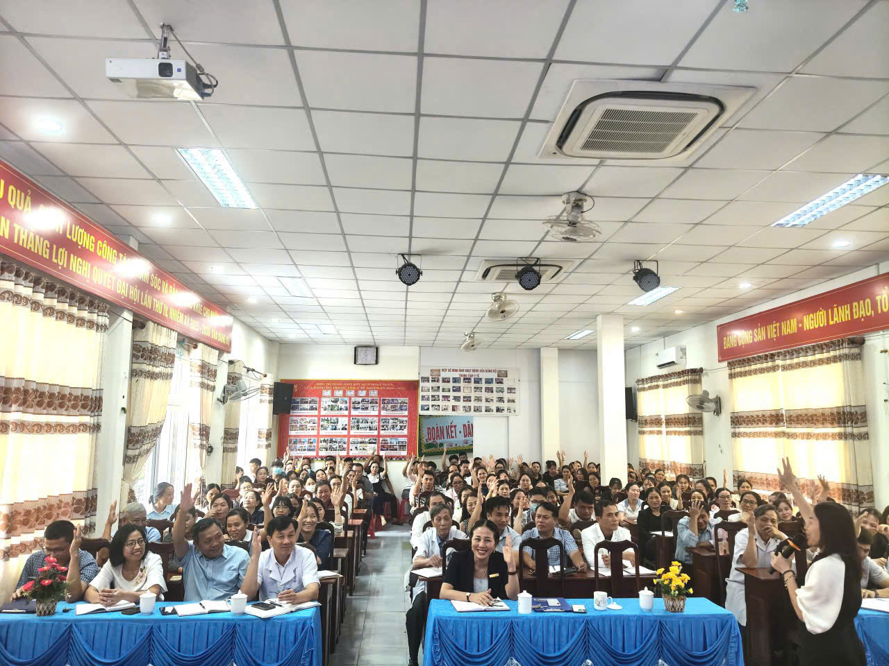 Nhằm xây dựng văn hóa ứng xử trong cơ sở khám, chữa bệnh, đồng thời thúc đẩy đổi mới phong cách phục vụ của đội ngũ y tế, hướng tới mục tiêu cao nhất là sự hài lòng của người bệnh, góp phần nâng cao chất lượng dịch vụ, đáp ứng yêu cầu phát triển của ngành y tế trong giai đoạn mới. Ngày 18/4/2026, Trung tâm Y tế M’Drắk đã tổ chức chương trình tập huấn “Thay đổi phong cách, thái độ phục vụ – Nâng cao chất lượng dịch vụ” cho toàn thể cán bộ, viên chức và người lao động của đơn vị. ThS.BS Phan Thị Ngọc Linh – Trung tâm Nghiên cứu Cải tiến Y tế (CHIR) đã tham gia giảng dạy; Ban Giám đốc cùng đại diện lãnh đạo các khoa, phòng và toàn thể viên chức, người lao động của Trung tâm đã tham gia tập huấn.