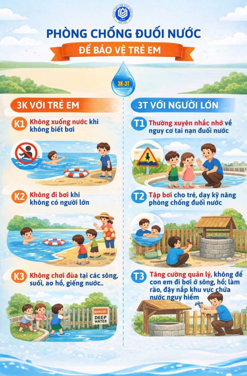 Tai nạn đuối nước là một trong những mối đe dọa hàng đầu đối với trẻ em. Các bậc phụ huynh hãy thực hiện và hướng dẫn các bé thực hiện nghiêm túc Thông điệp “3K-3T” để phòng tránh nguy cơ đuối nước, xây dựng môi trường vui chơi an toàn cho trẻ.