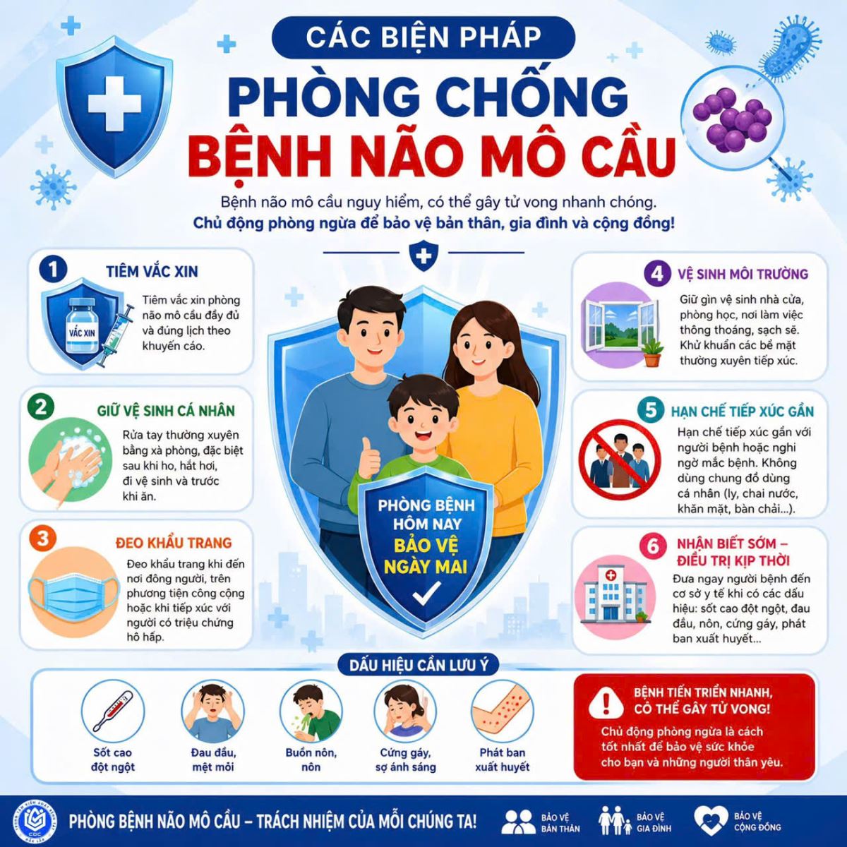 Bệnh não mô cầu là bệnh truyền nhiễm nguy hiểm, có thể diễn tiến nhanh và gây tử vong. Chủ động phòng bệnh để bảo vệ bản thân, gia đình và cộng đồng!